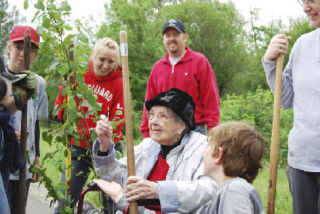 Friends at RedWood Family Church celebrated Waneta Shawhan’s 98th birthday last week with a tree planting party at Perrigo Community Park. From left