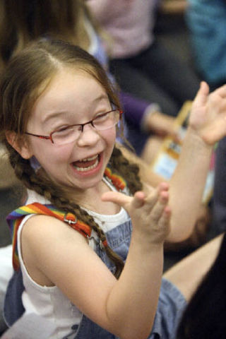 Faith Morrison doesn’t hold back her excitement during Junie B. Jones’ performance at Borders Books last Wednesday. Morrison was one of several hundred kids on hand at the Junie B. Jones Stupid Smelly Bus Tour show.