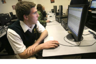 As students came to the polling place, a computer lab in the upper school area, they signed in for verification, got a sticker with a code they’d use to cast their vote online and checked their zip codes to make sure they knew which Congressional district was theirs.