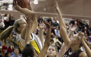 Late in the period, Redmond senior Courtney Martin scored off of a great feed from point guard Alicia Valentine to cut the deficit to three, 45-42, and then on the next possession post Marissa Pratt laid one in to pull the Mustangs within one, 45-44.