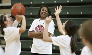 Three-time WNBA MVP Sheryl Swoopes watches students practice their skills during the First Annual Sheryl Swoopes Basketball Clinic at The Overlake School earlier this week. The two-day clinic taught boys and girls ages 7-14 the basic skills of basketball.