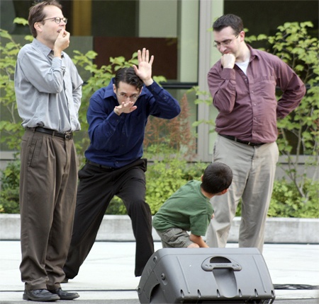 About 60 people sat on the dry, brown grass outside of Redmond’s City Hall on Friday to watch an improv performance by Unexpected Productions, a comedy group headquartered at the Market Theater at Pike Place Market.
