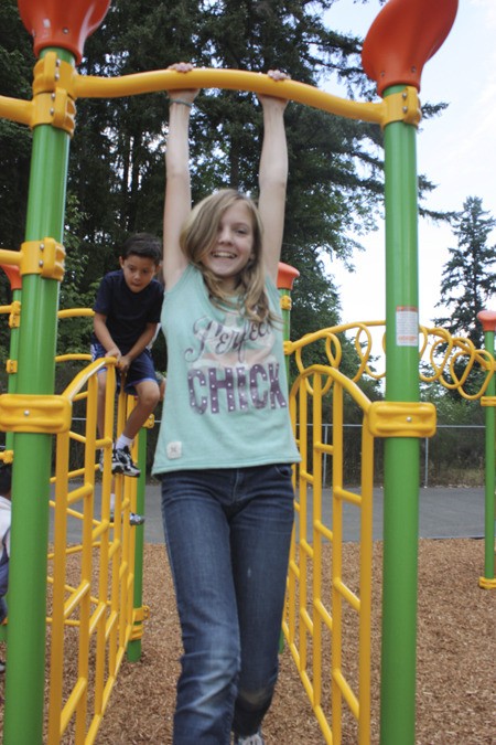 On Thursday, the school held a ribbon-cutting ceremony to celebrate its new playground equipment. The 40-foot-by-40-foot structure — which includes monkey bars to cross, bars to slide down, plenty of areas to climb on and a “triple shoot” tri-level basketball hoop — was installed by Northwest Playground Equipment, Inc. right before school began on Tuesday, but had been fenced off until the ceremony. While this was to deter students from playing on it, the fence only got them more eager as many would spend recess at the fence, looking through, “googly eyed” in excitement, said principal Melissa Pointer.