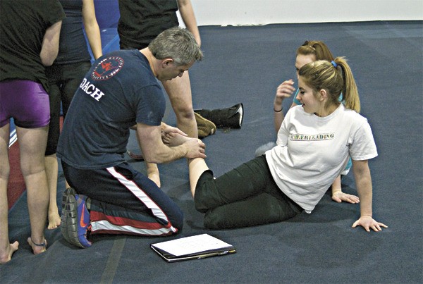 Redmond head gymnastics coach Jason Farr inspects the ankle of senior Ally Garcia during a recent practice