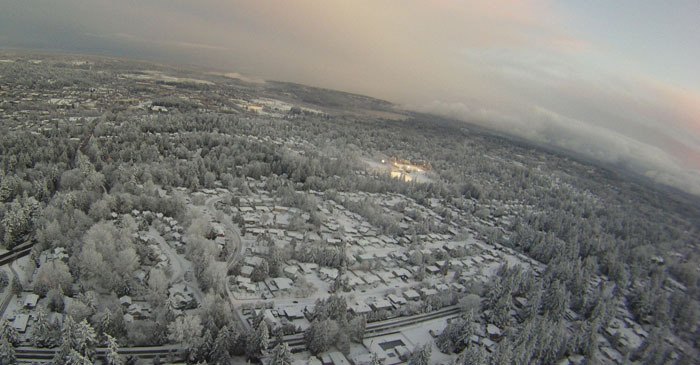 This is a view of snow-covered downtown taken from Redmond resident Zach Sweetser's remote control airplane. Marymoor Park and Lake Sammamish are seen in the right corner.