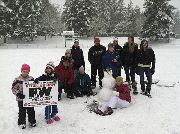 The Redmond West Little League (RWLL) crew enjoys a fun snow day at Hartman Park last Friday. RWLL is now accepting registrations for spring ball and will be holding a player tryout day this Saturday.