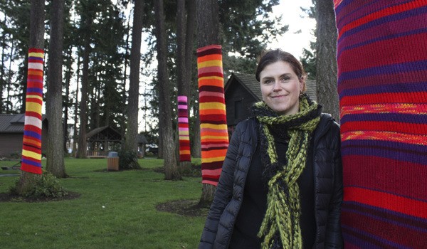 The Bothell resident works at Serial Knitters Yarn Shop in Kirkland and just happened to be driving by Anderson Park. She said knitting has become trendy but a lot of people tend to just knit scarves, which can be a bit utilitarian. Heidener said seeing Tidwell’s installation shows people how fun and creative knitting can be.