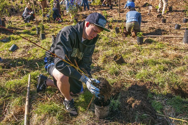 More than 100 residents planted several hundred trees and shurbs on a one-acre downtown site next to Bear Creek on Saturday as part of the Northwest Adopt A Stream Foundation program.