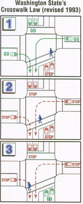 Drivers and pedestrians should be cautious when approaching crosswalks and never assume that the other is going to stop. A fine for violating this regulation is $124. To read the entire RCW, visit http://tinyurl.com/9yllo3a.