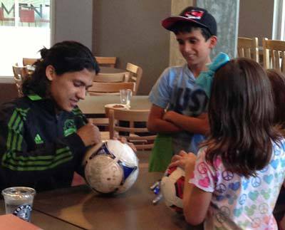 Young Seattle Sounders FC soccer fans enjoy spending some time with star player Fredy Montero on Monday at Top Pot Doughnuts in Redmond. About 100 people showed up to have Montero sign their T-shirts, soccer balls and other items.