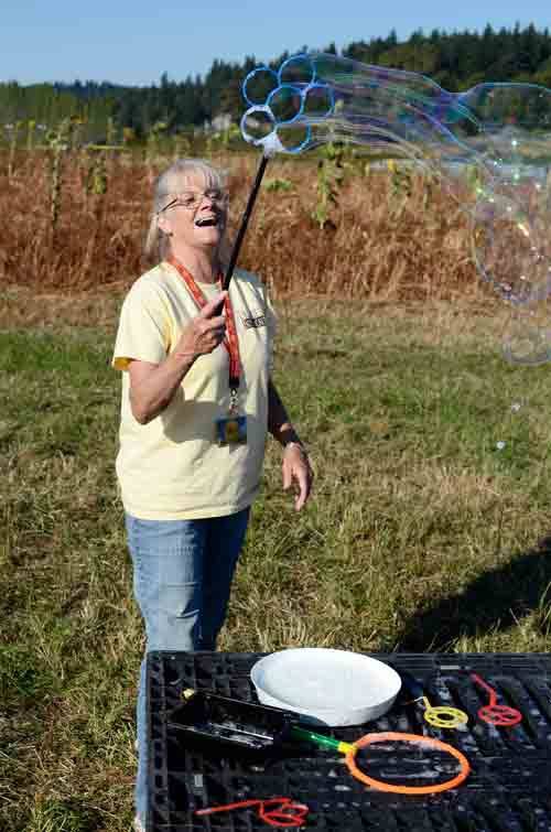 Dr. Maze’s Farm employee Teresa Grimm enjoys herself while blowing bubbles for visitors who came to pick out pumpkins last weekend. The farm is located at 15410 N.E. 124th St. in Redmond. People can visit the farmyard to explore the four-acre Chicken Field Maze, take a hayride tour of the farm and mini-mazes and more. For more information, visit www.DrMazesFarm.com.