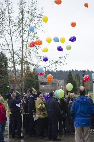 Citizens and first responders from Redmond release 26 balloons into the sky in honor of the victims of the Sandy Hook Elementary shooting in Connecticut.