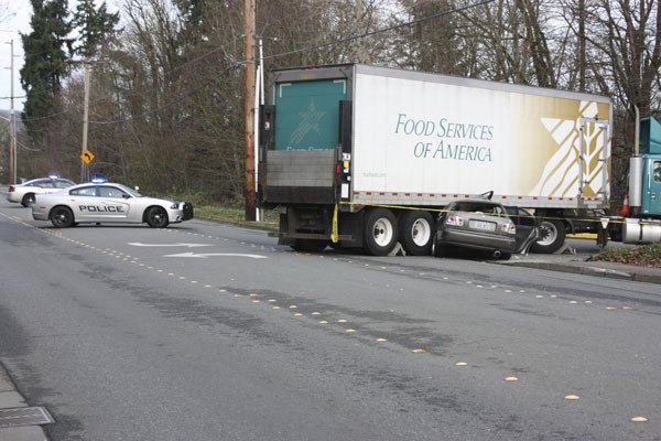 A Food Services of America semi-truck and car collided in the 7900 block of Willows Road in Redmond shortly before 10 a.m. Monday.