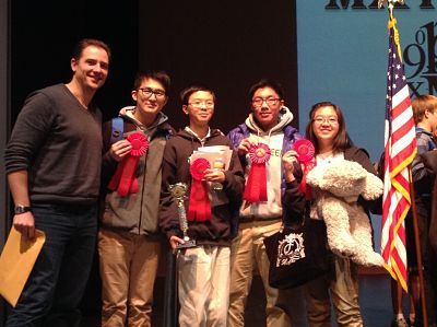 Caleb Ji, freshman at The Bear Creek School, has qualified to sit for the USA Junior Mathematical Olympiad exam on April 30 and May 1. Ji (center) celebrates a second-place team finish at the state-level Math Is Cool Masters competition last December with his coach Steven Prokopchuk and fellow team members sophomores Angela Eun, Chris Yang and James Choi. Ji also holds the third-place trophy he earned individually in the calculus division.