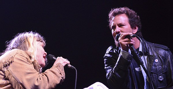 The pioneering Los Angeles punk band, which got its start in the dingy Masque club in 1977, kicked off the evening with a gritty 45-minute set that began with “Your Phone’s Off the Hook, But You’re Not” from its debut album and closed with Pearl Jam’s Eddie Vedder taking the stage to add vocals to the ripping “Devil Doll” from its fourth album “More Fun in the New World.” (Vedder also joined X for “The New World” earlier in the set as the crowd cheered in approval.)