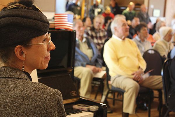 Sophisticated Swing band pianist Terry Turner takes a break and listens intently to a speaker this afternoon at the Redmond Senior Center’s Veterans Celebration. The Redmond Senior Chorus also performed in front of about 200 people, including veterans and city officials.