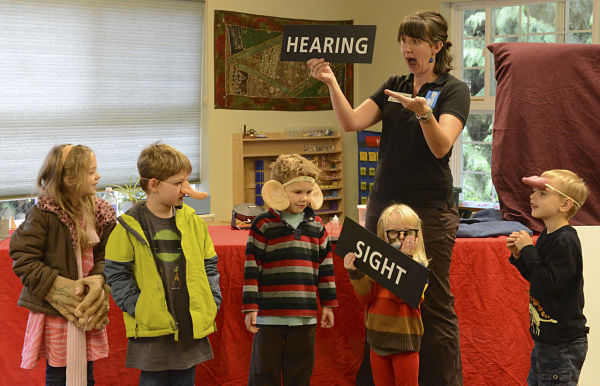 Pacific Science Center’s Science on Wheels instructor Nicolette Newman teaches students about their five senses Tuesday morning at the Montessori Children’s House in Redmond.