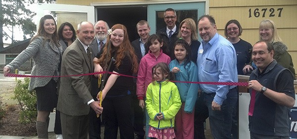Kringles Bakery owner Mandy Schwarzinger (middle) cuts the ribbon during her grand-opening ceremony today alongside Redmond City Council member John Stilin. Also pictured in the crowd is Redmond City Council member David Carson, in blue shirt. The family owned business is located at 16727 Redmond Way.