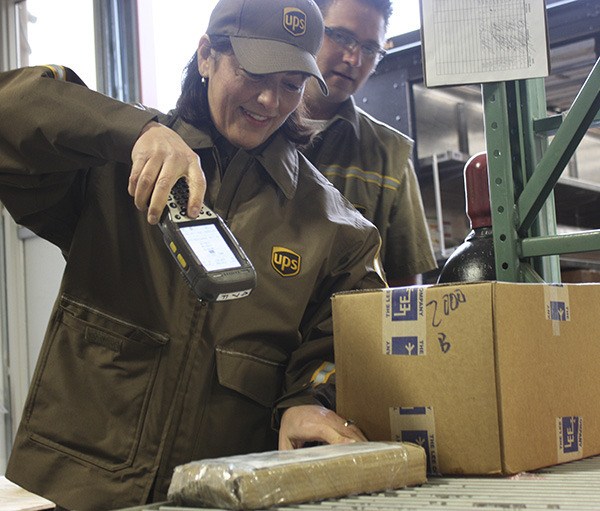 Congresswoman Suzan DelBene scans a package while UPS delivery driver Mike Vallimont watches on Wednesday morning at Triumph Aerospace Group on Redmond Ridge. DelBene
