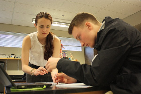 Sarah Herron (left) and Thomas Barnett work together on a lab during a recent class for Redmond High School’s STEM signature program. The program is focused on global health.