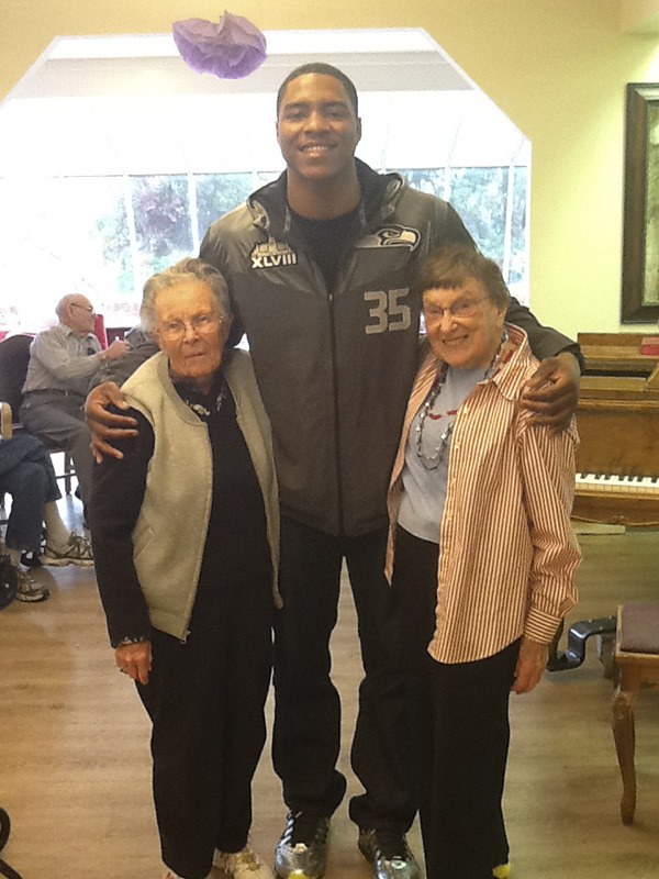 Seattle Seahawk DeShawn Shead visits with Redmond Heights Senior Living residents — left, Doris Thompson and right, Helen Schumacher — last month. According to Samantha Mayer, Redmond Heights recreation assistant, during his 90-minute visit, Shead also played the piano as the room full of residents sang. During the season, Mayer held Seahawks Super Bowl and playoff parties, which featured blue-and-green punch, raffles for Hawks gear and football trivia at half time.