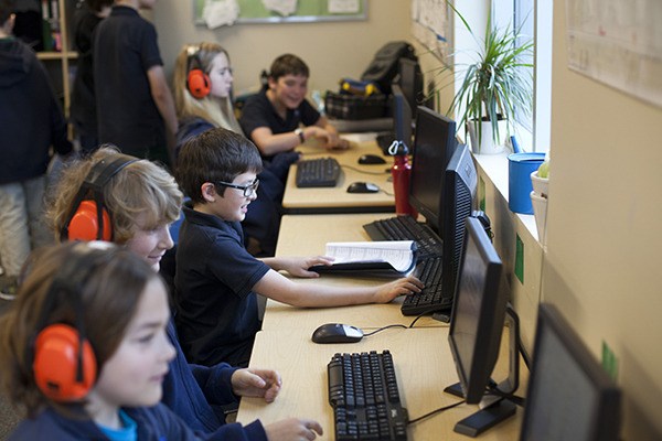 The students do a variety of exercises that are either auditory, on the computer or at a desk with a pen and paper.