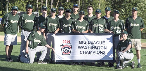 Redmond District 9 Bigs All-Stars recently defeated Burien District 7 — 9-1 — to win state behind the complete-game pitching of Brenden Narloch. The pitching staff, including Chandler Homer, Jack Baugher, Kolter Raudebaugh and Narloch, allowed only two earned runs during the state tournament. At regionals in Bremerton, the locals lost to teams from Northern California, Oregon and Arizona.Standing left to right: Coach Don Gonzales, coach Scott Van De Vanter, George Hebard, Ian Kenney, Mitchell Eidem, Daniel Gonzales, Chandler Homer, Jack Baugher, Kolter Raudebaugh, Brenden Narloch, Morgan Curry, Riley Robinson and manager Don Kenney. Kneeling left to right: Jay Reierson and Alex Shaw.