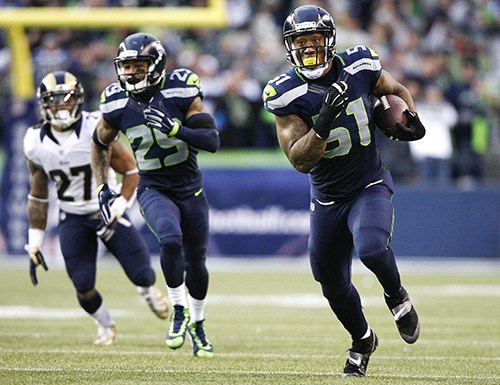 Bruce Irvin returns an interception for a touchdown against St. Louis in Week 17.