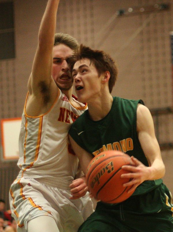 Redmond’s Kevin Carpenter, right, drives to the hoop while Newport’s Jace Goforth guards him during tonight’s 4A KingCo tournament game. Redmond won, 50-47.