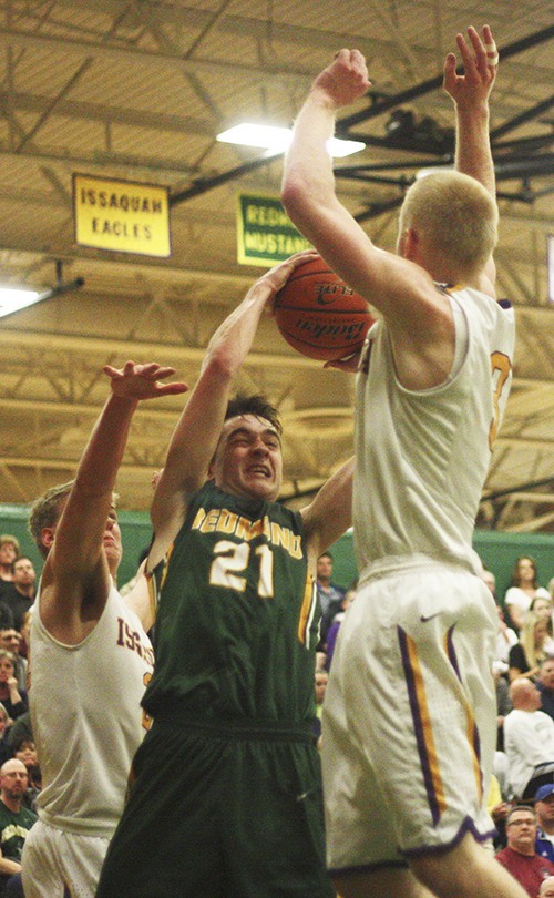 Redmond’s Jake Talbot (middle) drives to the basket while Issaquah defenders close in during tonight’s 4A KingCo Tournament game. Issaquah won, 84-54, to end Redmond’s season.