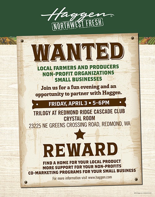 There will be an informal public meeting from 5-6 p.m. on April 3 at the Trilogy at Redmond Ridge Cascade Club, Crystal Room, 23225 N.E. Greens Crossing Road. At the meeting, local farmers and producers can discuss selling their wares on Haggen’s shelves; nonprofit organizations can learn about Haggen’s community giving; and small businesses can explore co-marketing programs.