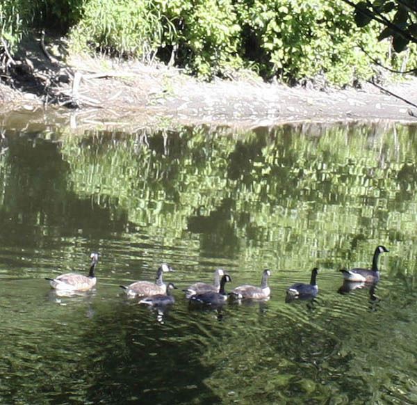 Canada geese are all lined up for their journey on the Sammamish River this morning in Redmond.