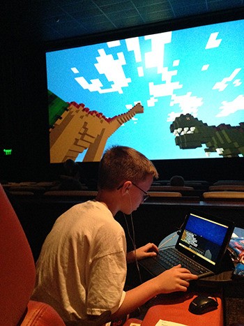 During these one-off events, participants are playing “Minecraft,” which features a multiplayer mode so they can play together in teams. The teams are made up of players within the theater and the kids play on their own laptops (SLG also has a few laptops on hand for those who do not have one or if technical difficulties arise). In addition, significant moments of gameplay and other points of interest are highlighted and featured on the big screen.