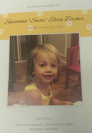 People filled the Happy Valley Grange in Redmond on Thursday morning to share stories about Susie and comfort the Redmond family and each other. Susie, 2, passed away on July 1 after being struck by a car in Redmond Town Center.