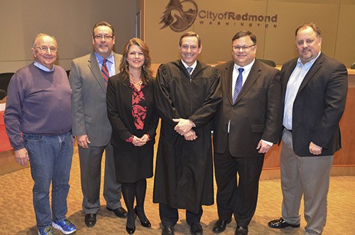 Honorable Judge Michael Finkle (middle) of the King County District Court was the officiant in the swearing-in ceremony of Redmond Mayor John Marchione (second from right) and City Council members (from left) Hank Myers, Hank Margeson, Angela Birney and David Carson on Dec. 15 at Redmond City Hall.