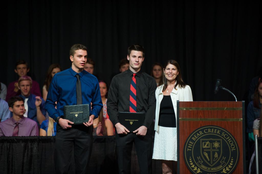 The Bear Creek School’s Sam Humphries and John Lee both received commissions to the U.S. Military Academy at West Point. They received their commissions in person on June 10 from Marion Thorkildsen, West Point admissions office representative, who attended Bear Creek’s annual Upper School Honors Assembly.