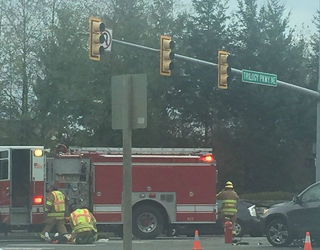 One driver sustained minor injuries in a two-car accident this morning at Northeast Novelty Hill Road and Trilogy Parkway Northeast.
