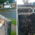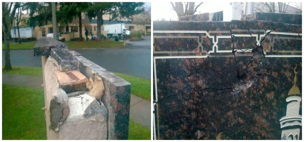 The granite sign in front of its facility was smashed, with a portion of the top border broken off and a crack on the front of the sign.