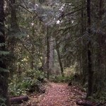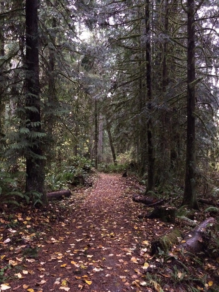 I’m in a forest of cedar, Douglas fir and maple trees, a giant umbrella of branches keeping me dry. Soft chirping of birds and the patter of raindrops are the only sounds.