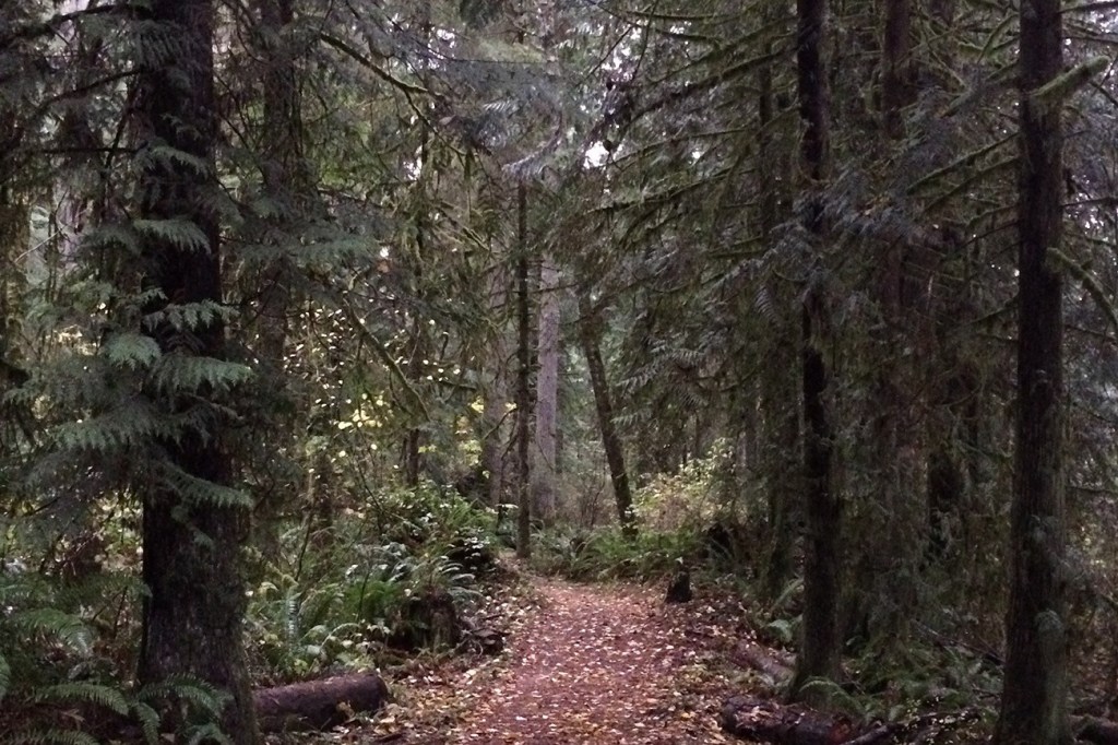 The parking lot of Redmond Watershed Preserve is an easy 10-minute drive from downtown Redmond. It’s raining as I climb out of the car, so I pull on a waterproof jacket, and set off down the trail.