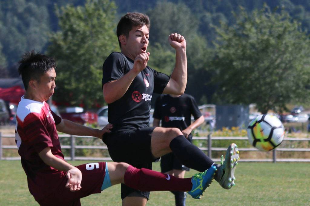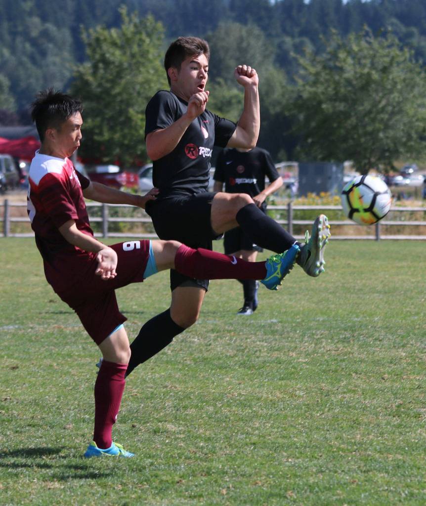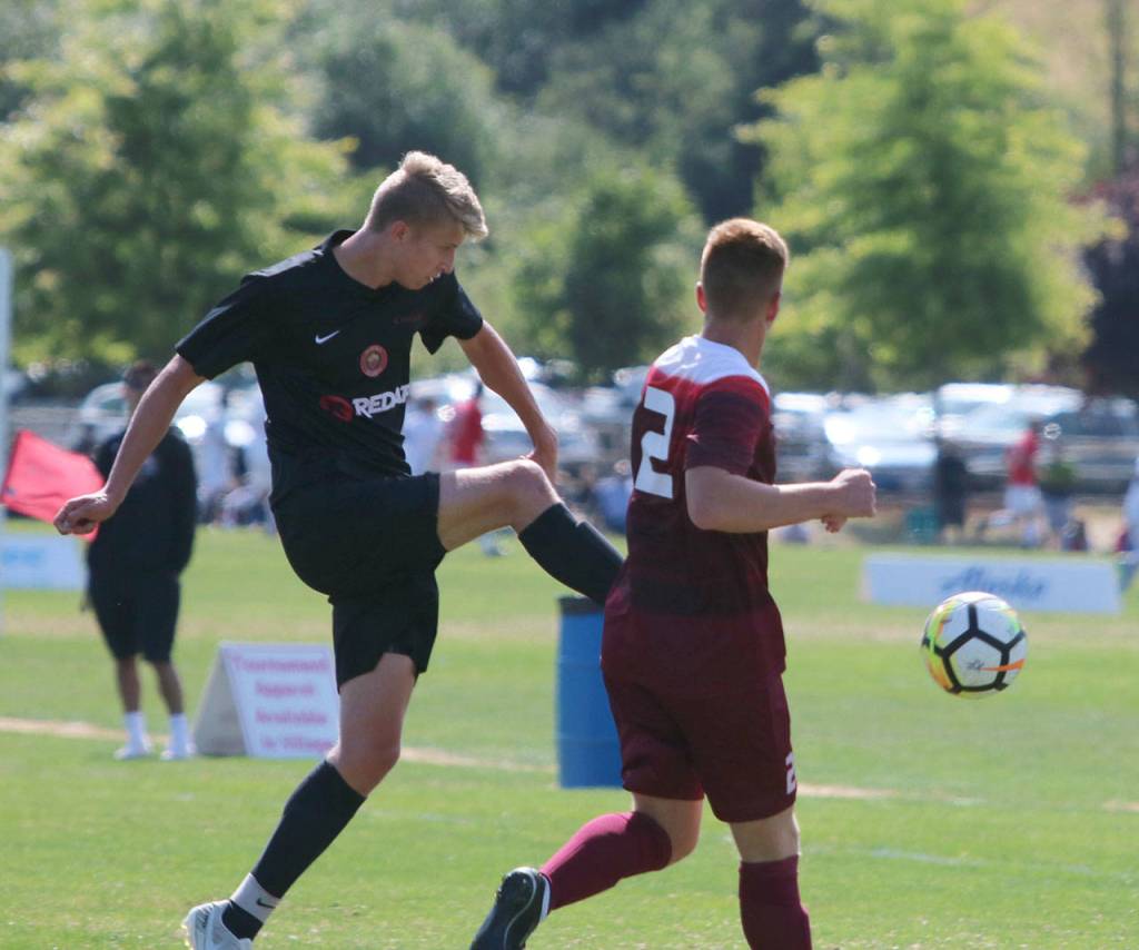A Redmond-based Crossfire Premier B99A player (right) challenges a Pacific Northwest SC 99 Maroon opponent for the ball on Monday morning at 60 Acres Park in Redmond. The teams battled in the U19 Super Group, and Crossfire won, 2-1. The Crossfire squad then defeated Washington Premier FC B99 White, 1-0, in the final. The Crossfire Challenge College Showcase for boys and girls U15-U19 teams kicked off last Friday and ran through Monday. The premier youth tournament in the Pacific Northwest features teams from the United States and Canada.