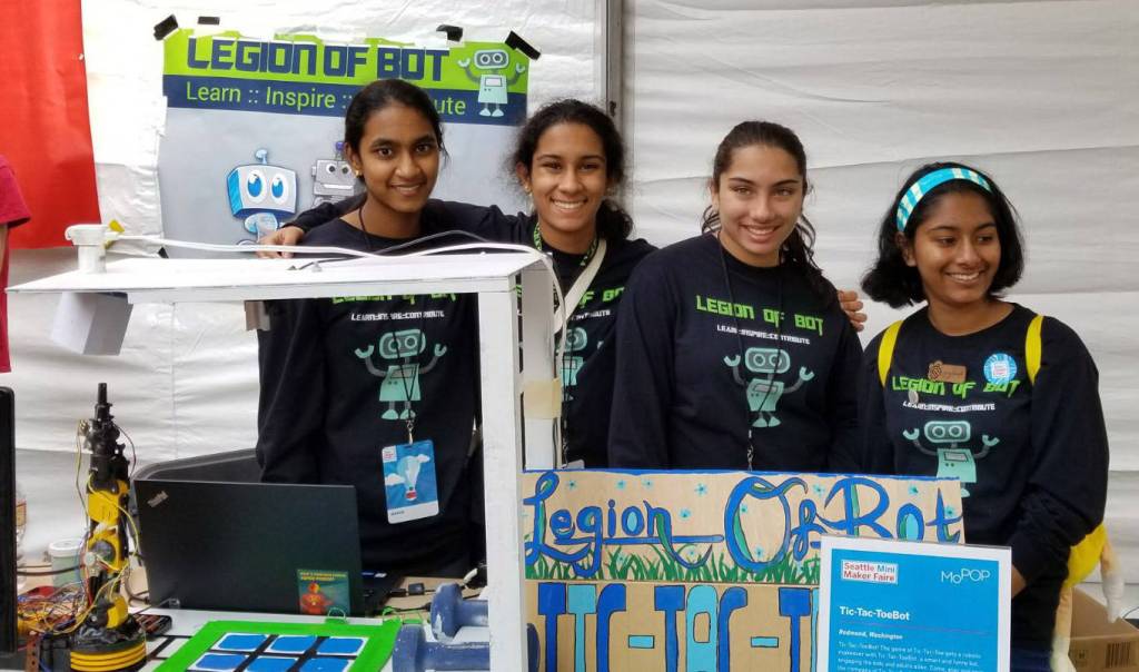 The girls have designed a robot that plays Tic-Tac-Toe against a human player and displayed their creation last weekend at the Seattle Mini Maker Faire at MoPOP. It features advanced vision, image recognition and an artificial intelligence module that picks the next best move in response to the player’s move.
