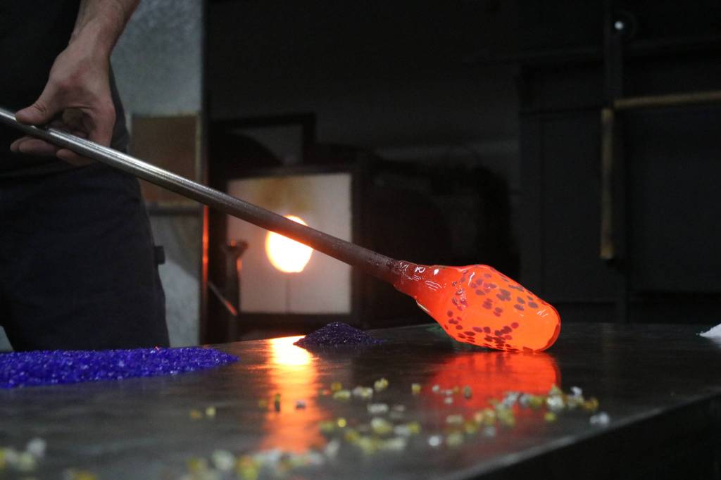 Brad Stearns took a long metal pole out of a furnace. At the end was a molten glob of red-hot glass.