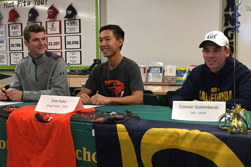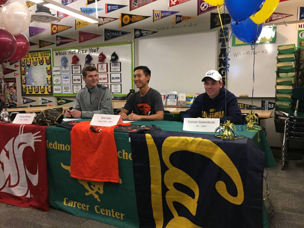 From left to right, Redmond High senior athletes Connor Barison, Sean Kato and Connor Golembeski sign their national letters of intent earlier this month in the school career center in front of family, friends and coaches. Barison will play baseball at Washington State University, Kato will golf at Oregon State University and Golembeski will golf at University of California, Berkeley. Courtesy photo