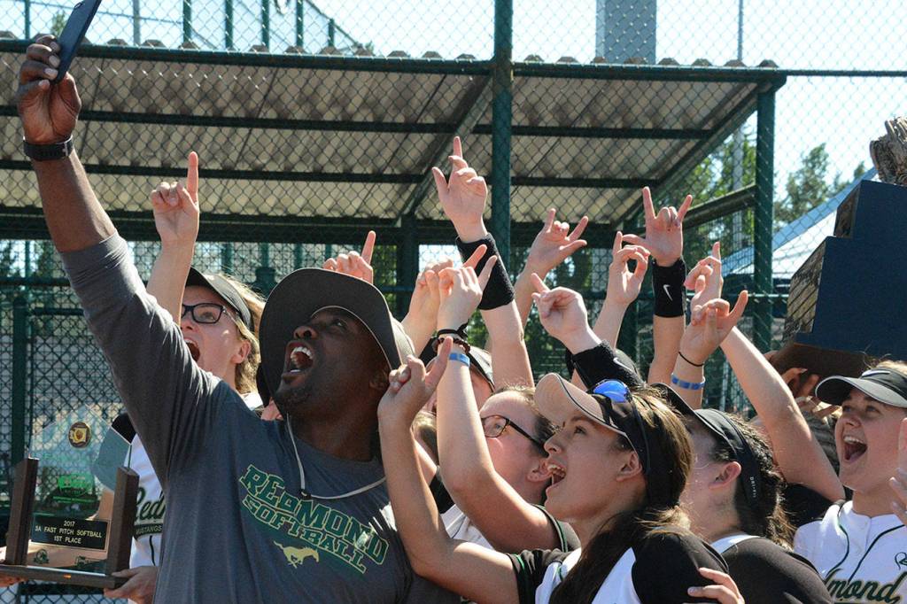 Redmond High parent Lawyer Milloy takes a Snapchat photo with the 3A state softball champs. Andy Nystrom, Redmond Reporter