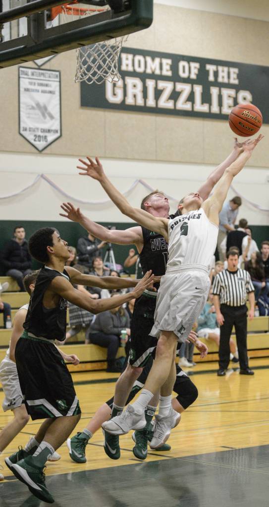 Overlake senior Tellier Lundquist, middle left, and Bear Creek junior Trevor McRae, right, go up for a rebound. Courtesy of Cindy McCahill