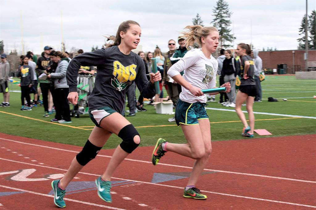 Redmond High’s Nicole Pangborn and Amelia Muscott run in the 4×400-meter relay on Saturday. More than 250 people — athletes, community participants and supporters — attended the event. “It was a great inaugural event. A lot of credit belongs to our booster club and coach Pete Whitmore for conceptualizing, organizing and bringing the event to fruition. But ultimately, it’s the community that supports the Redmond High School track program, athletes and coaches who made the Redmond Relays a success,” said coach Stuart Lui. Photo courtesy of Stuart Lui