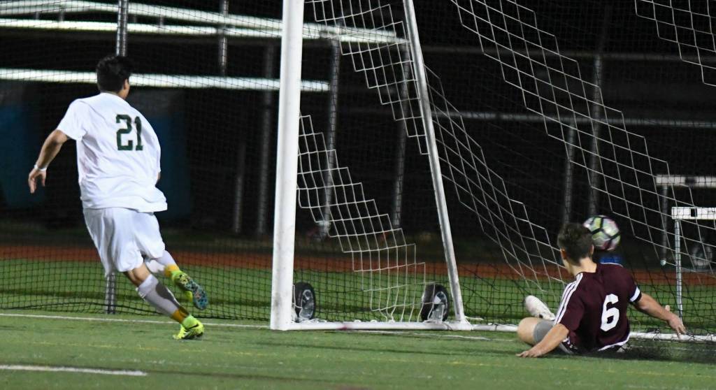 Redmond’s Angel Hernandez tallies the Mustangs’ second goal with about three minutes to go in the locals’ 2-0 victory over Mercer Island on Monday. Jacen Stein also scored on a penalty kick. Photo courtesy of Dale Garvey