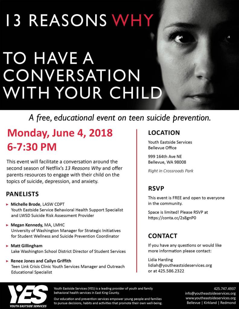 Youth Eastside Services (YES) will host a free educational event focused on preventing teen suicide, titled “13 Reasons Why to Have a Conversation With Your Child”.