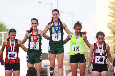 Bear Creek’s Olivia Markezich (middle, blue ribbon) won the 1A state 1,600-meter championship last month at Eastern Washington University. She won with a time of 5:02.41 and her sister Andrea (second from left, red ribbon) took second in 5:06.88. Olivia took second in the 800 meters with a time of 2:18.51, setting a new school record. In the 3,200 meters, Andrea took second in 11:04.30 and Olivia took third in 11:06.70. Long-jumper Brielle Baker broke a 15-year-old school record with a mark of 17-00.75 to place sixth. Ian Levasseur took 12th in the 400 meters in 52.59. The girls’ team placed fourth overall and the boys’ squad won the state academic championship. Photo courtesy of Ron Markezich
